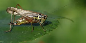 to produce a shrill, grating sound, as a cricket does, by rubbing together certain parts of the body; shrill